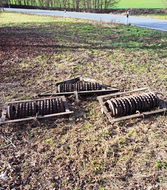 Das Foto gehört zur Serie "Landwirtschaft". Es zeigt eine landwirtschaftliche Ackerwalze, Cambridge-Walze oder einen Cultipacker. Sie dient zur Rückverfestigung des Bodens nach dem Pflügen oder Säen, um zu lockere Erde zu verdichten. Die Ringe zerkleinern dabei grobe Erdschollen und ebnen die Oberfläche ein. Das Bild ist unter CC0 lizenziert und kann somit frei verwendet werden.