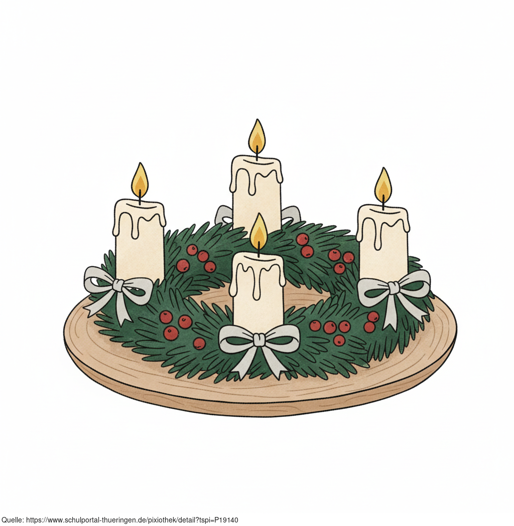 Das Bild zeigt einen gezeichneten Adventskranz. Das Bild wurde mittels einer KI (Gemini) erstellt und ist unter CC0 lizenziert. Weitere Bilder aus Herrn Emrich-Försters Bild-Archiv findet man hier: https://pix.foerster.rocks/