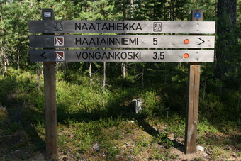 Abgebildet ist ein typischer finnischer Wegweiser.