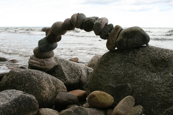 Abgebildet ist ein Steinbogen am Strand. Derartige Gebilde werden immer wieder von Urlaubern und Einheimischen als Statikspielerei errichtet.