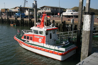 Abgebildet ist ein Seenotrettungsboot im Hafen.