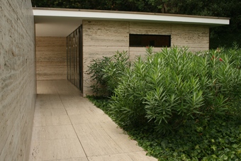 Das Foto gehört zur Serie "Deutscher Weltausstellungspavillon Barcelona 1929". Der deutsche Architekt Ludwig Mies van der Rohe entwarf diesen Pavillon. Er gilt heute als Architekturikone des 20. Jahrhunderts. Das Bild zeigt eine Detailansicht vom Pavillon. Es gelten die Nutzungsbedingungen der Mediothek und Pixiothek.