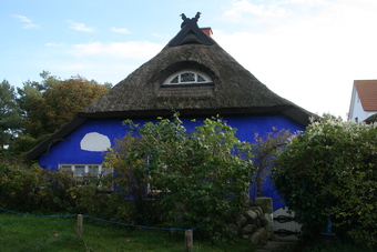 Die Bilderserie enthält ausgewählte Fotografien von der Insel Hiddensee. Dieses Bild zeigt die "Blaue Scheune" in Vitte. Es ist ein niederdeutsches Hallenhaus, ein Wohnstallhaus in Fachwerkbauweise mit Reetdach. Es beherbergte neben der Wohnung eines Bäckers und eines Müllers auch die Backstube und den Stall. Es gelten die Nutzungsbedingungen der Mediothek und Pixiothek.