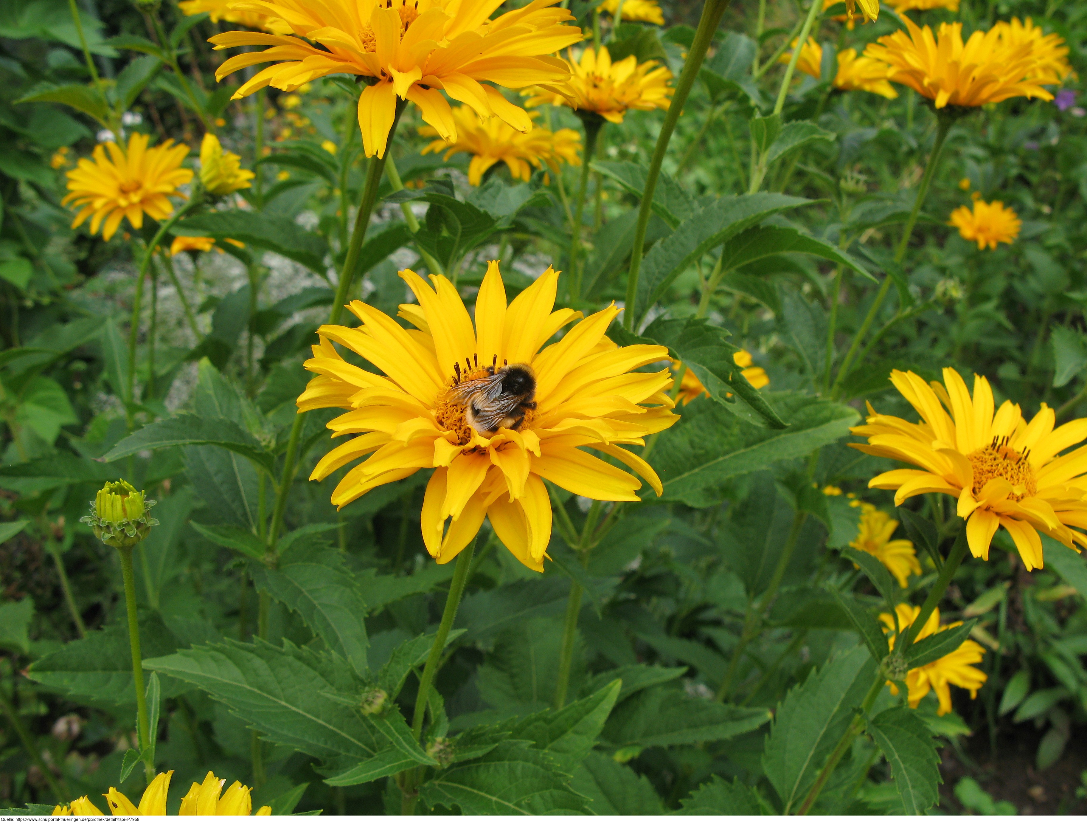 Das Foto gehört zur Serie Blumen im Garten. Es zeigt eine Ringelblume (Calendula). Sie ist einjährig und wächst am besten in Gruppen. Die Ringelblume ist nicht winterhart, wächst aber im Folgejahr durch ihren winterharten Samen von selbst wieder. Calendula officinalis war die Heilpflanze des Jahres 2009. Hier sucht eine Erdhummel nach Nektar. Es gelten die Nutzungsbedingungen der Mediothek und Pixiothek.
