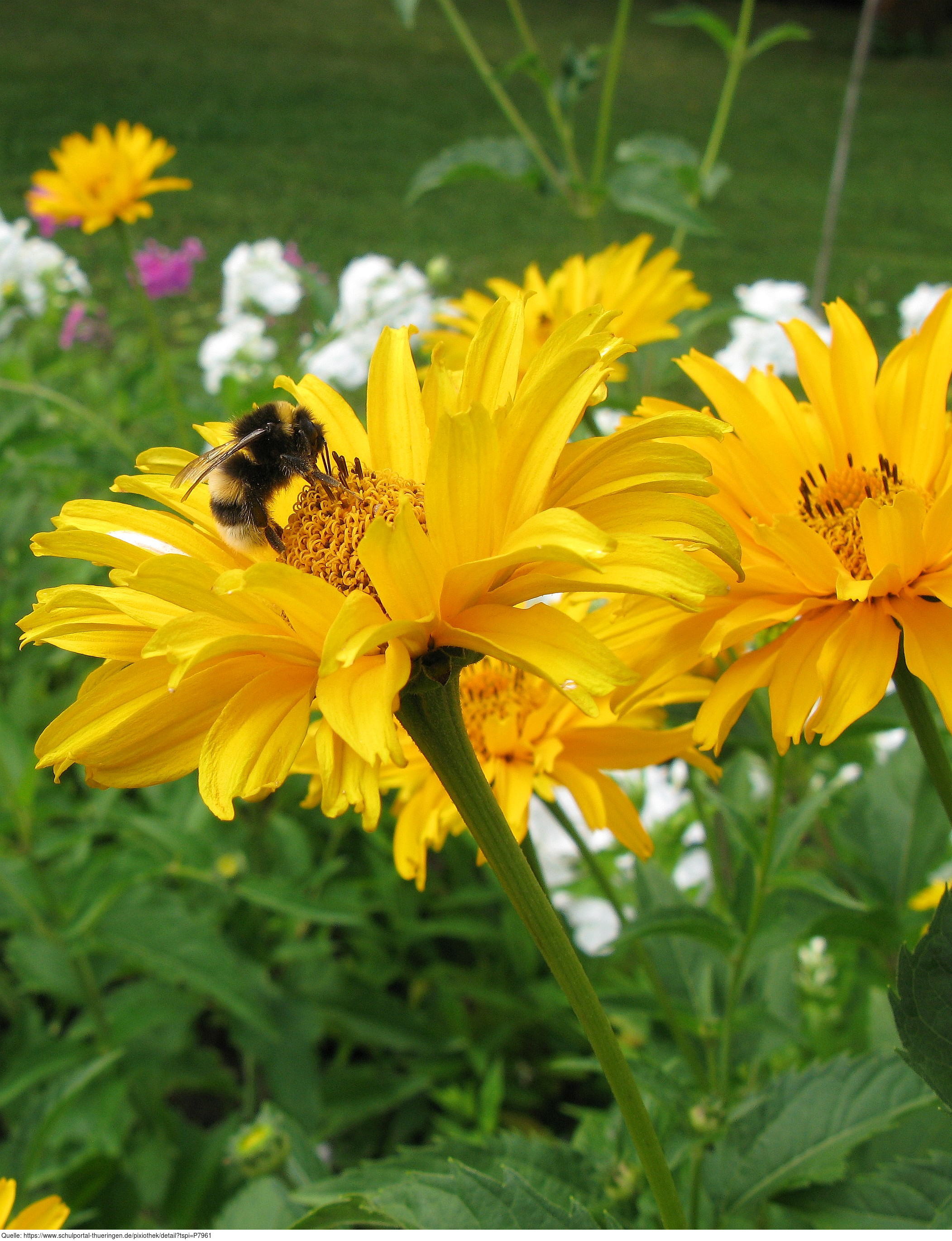 Das Foto gehört zur Serie Blumen im Garten. Es zeigt eine Ringelblume (Calendula). Sie ist einjährig und wächst am besten in Gruppen. Die Ringelblume ist nicht winterhart, wächst aber im Folgejahr durch ihren winterharten Samen von selbst wieder. Calendula officinalis war die Heilpflanze des Jahres 2009. Hier sucht eine Erdhummel nach Nektar. Es gelten die Nutzungsbedingungen der Mediothek und Pixiothek.