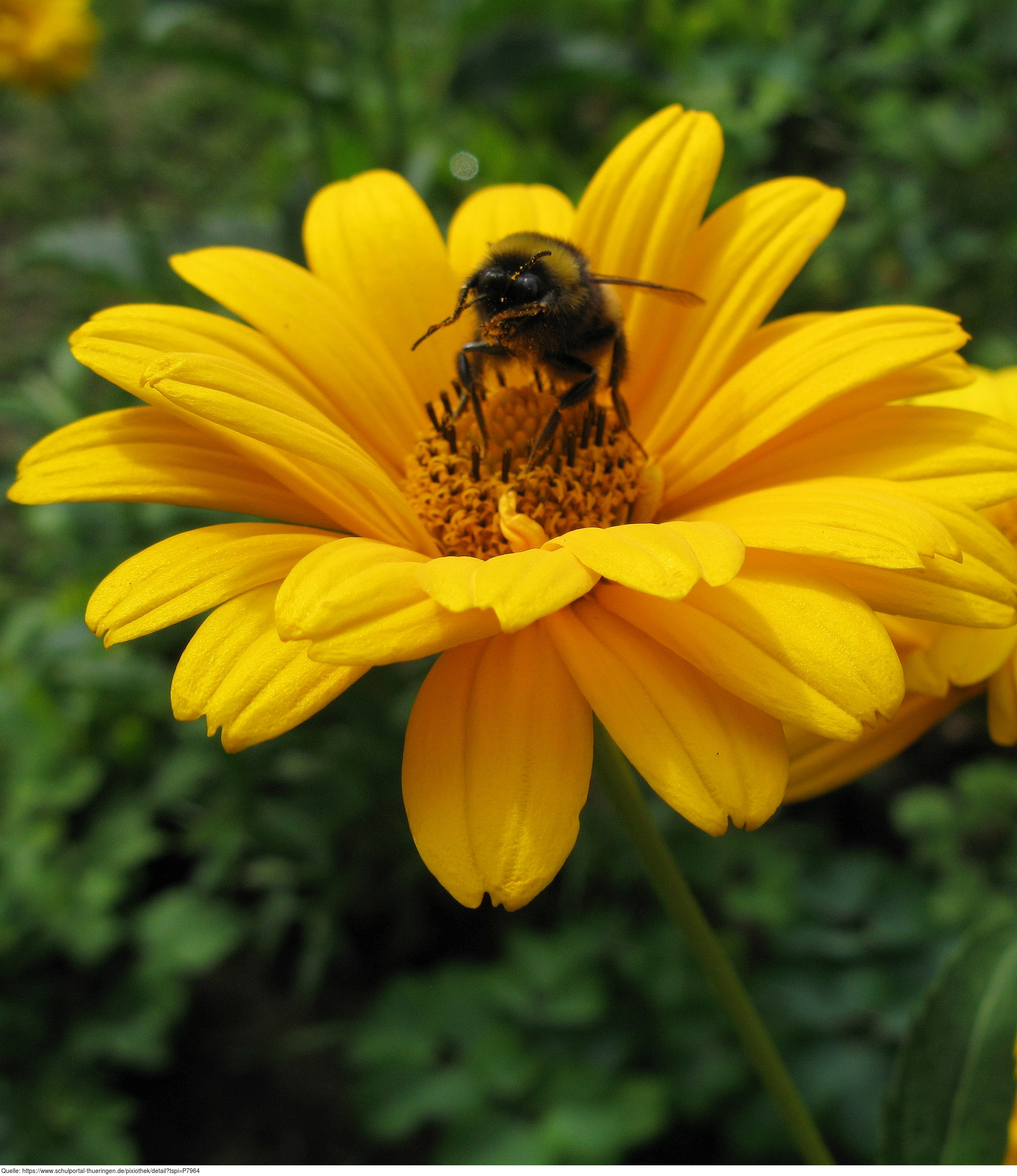 Das Foto gehört zur Serie Blumen im Garten. Es zeigt eine Ringelblume (Calendula). Sie ist einjährig und wächst am besten in Gruppen. Die Ringelblume ist nicht winterhart, wächst aber im Folgejahr durch ihren winterharten Samen von selbst wieder. Calendula officinalis war die Heilpflanze des Jahres 2009. Hier sucht eine Erdhummel nach Nektar. Es gelten die Nutzungsbedingungen der Mediothek und Pixiothek.