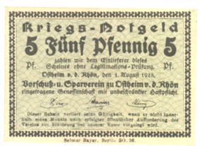 Das Foto gehört zur Serie "Währungen im Deutschen Kaiserreich 1914 bis 1918". Es zeigt Kriegs–Notgeld über "Fünf Pfennig" vom 01. August 1918 . Es gelten die Nutzungsbedingungen der Mediothek und Pixiothek.