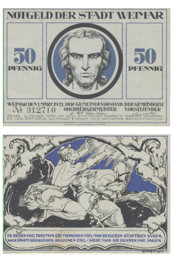 Das Foto gehört zur Serie "Zahlungsmittel in der Weimarer Republik (1918-1933)". Es zeigt Notgeld über "Fünfzig Pfennige" der Stadt Weimar vom 01. März 1921 . Es gelten die Nutzungsbedingungen der Mediothek und Pixiothek.
