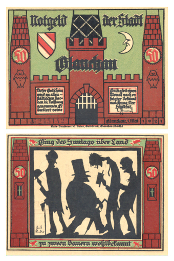 Das Foto gehört zur Serie "Zahlungsmittel in der Weimarer Republik (1918-1933)". Es zeigt Notgeld über "Fünfzig Pfennige" der Stadt Glauchau vom 01. Mai 1921 . Es gelten die Nutzungsbedingungen der Mediothek und Pixiothek.