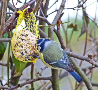 Das Foto gehört zur Serie "Vögel im Winter". Es zeigt eine Blaumeise am Meisenknödel. Es gelten die Nutzungsbedingungen der Mediothek und Pixiothek.