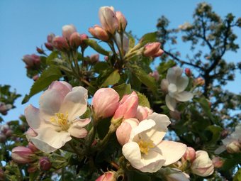 Das Foto gehört zur Serie "Obstbäume". Es zeigt Blüten an einem Apfelbaum. Das Bild ist unter CC0 lizenziert und kann somit frei verwendet werden.