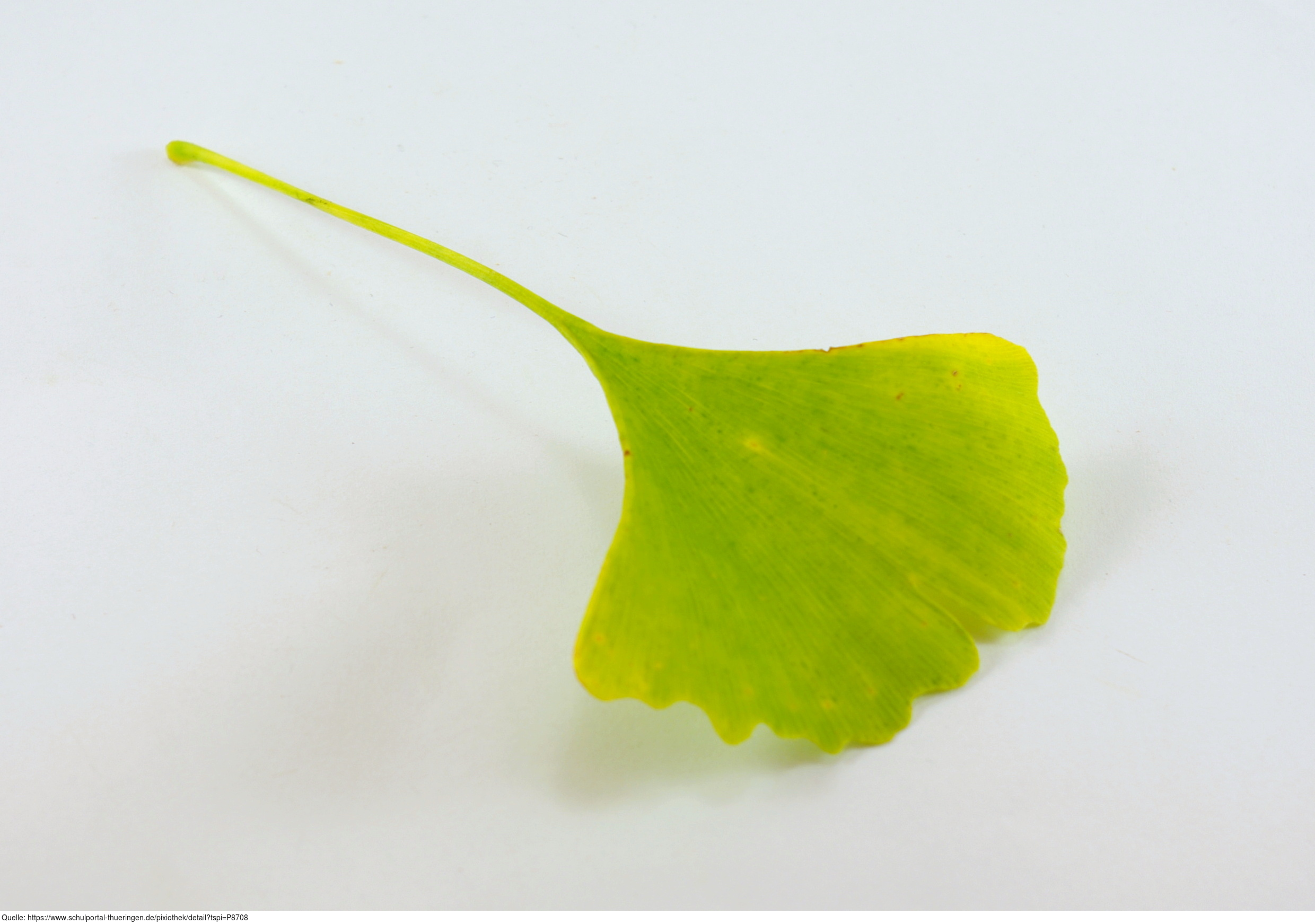 Das Foto gehört zur Serie "Blätter von Laubbäumen". Es zeigt ein Gingkoblatt (Ginkgo biloba), laut Duden ist auch die Schreibweise Ginko möglich. Das Bild ist unter CC0 lizenziert und kann somit frei verwendet werden.