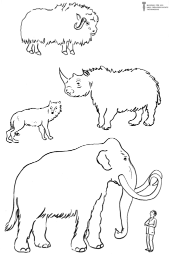 Das Bild gehört zur Serie "Zeichnungen Steinzeit - Museum für Ur- und Frühgeschichte Thüringens". Abgebildet sind Tiere der Eiszeit. Es gelten die Nutzungsbedingungen der Mediothek und Pixiothek.