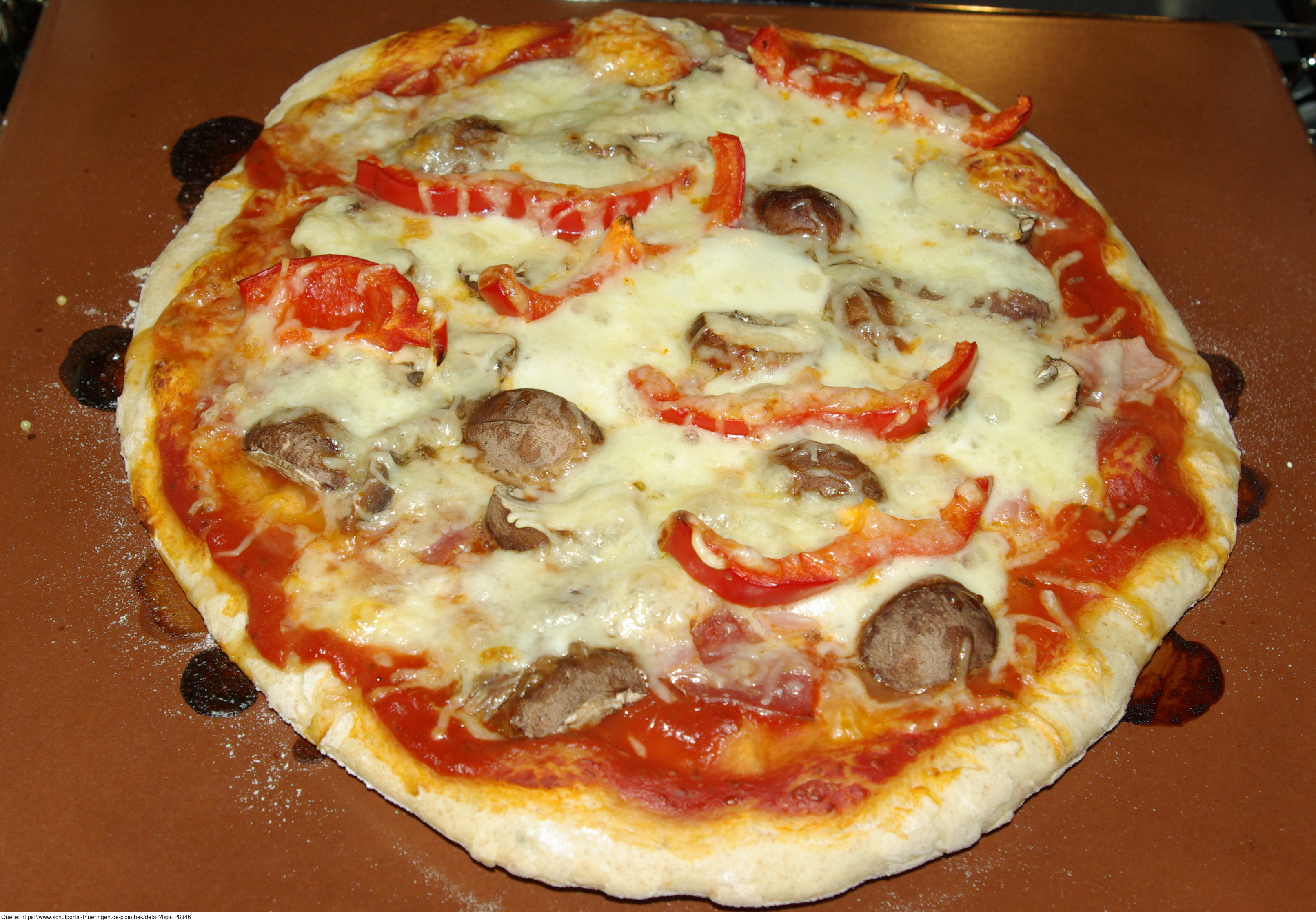 Das Foto gehört zur Serie "Nahrungsmittel". Es zeigt eine Pizza, ein vor dem Backen würzig belegtes Fladenbrot aus einfachem Hefeteig. Das Bild ist unter CC0 lizenziert und kann somit frei verwendet werden.