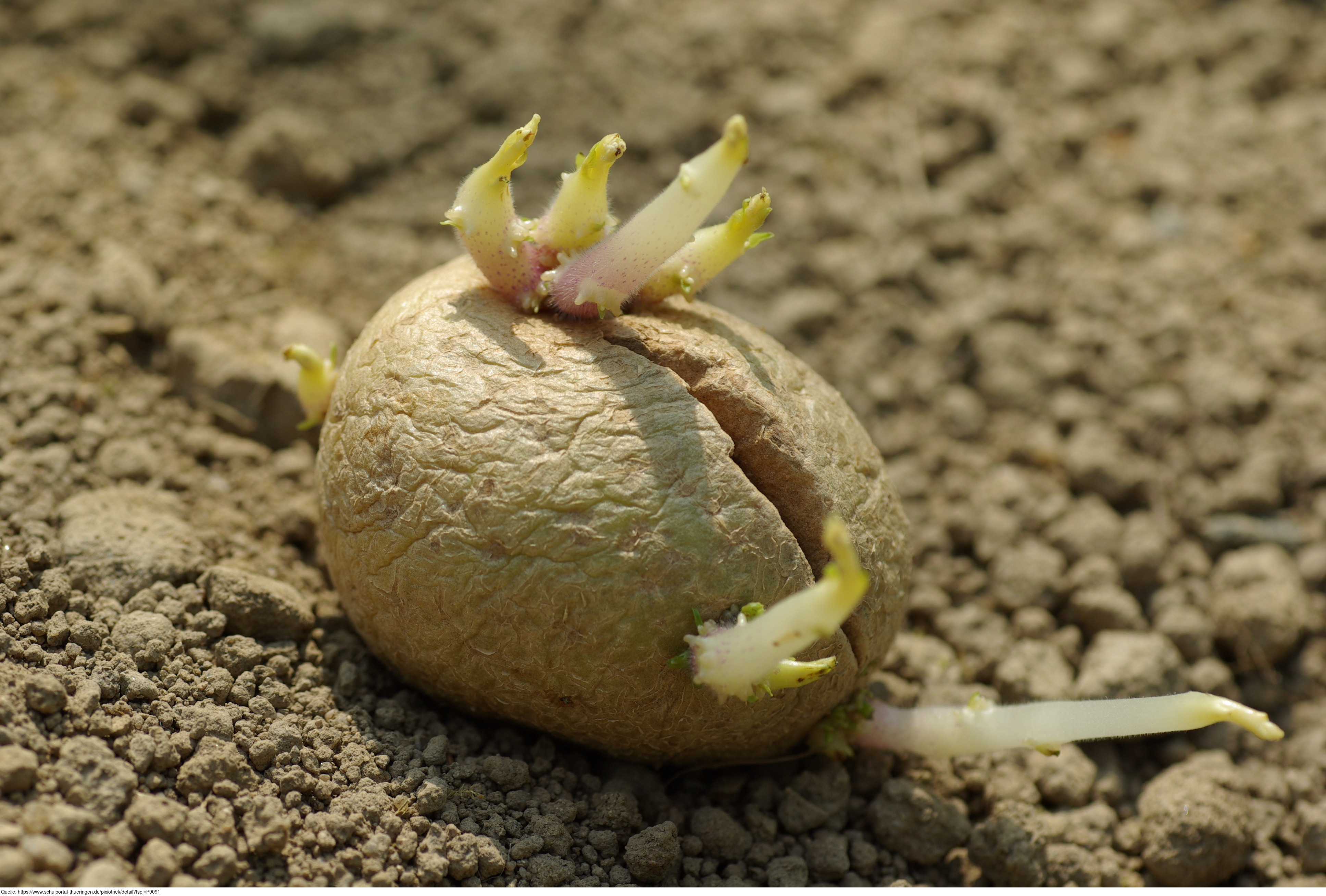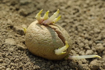 Das Foto gehört zur Serie "Nutzpflanzen". Es zeigt eine Saatkartoffel mit Dunkelkeimen auf dem Feld. Das Bild ist unter CC0 lizenziert und kann somit frei verwendet werden.