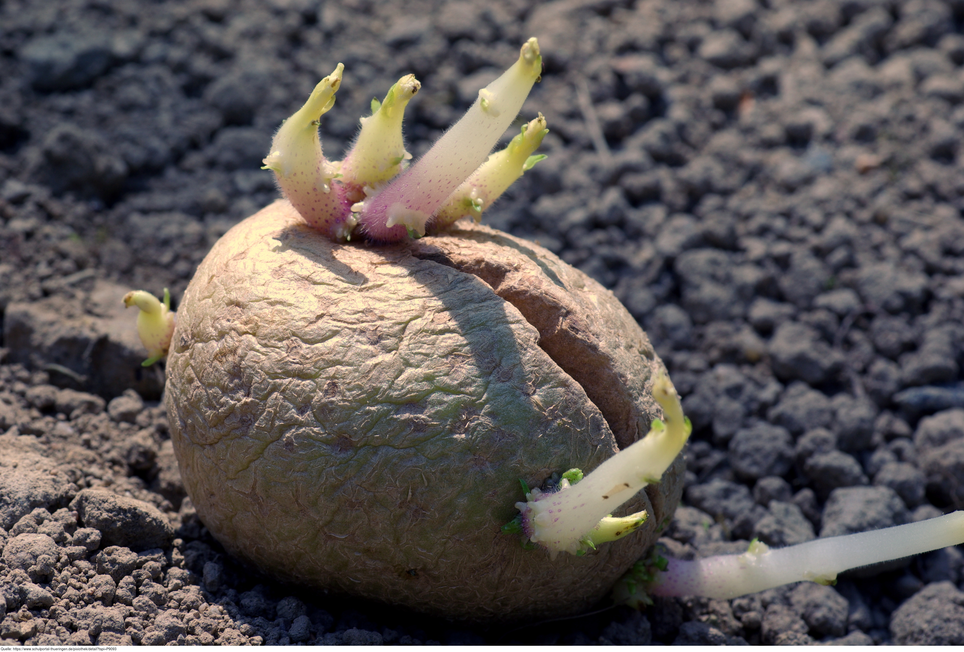 Das Foto gehört zur Serie "Nutzpflanzen". Es zeigt eine Saatkartoffel mit Dunkelkeimen auf dem Feld. Das Bild ist unter CC0 lizenziert und kann somit frei verwendet werden.
