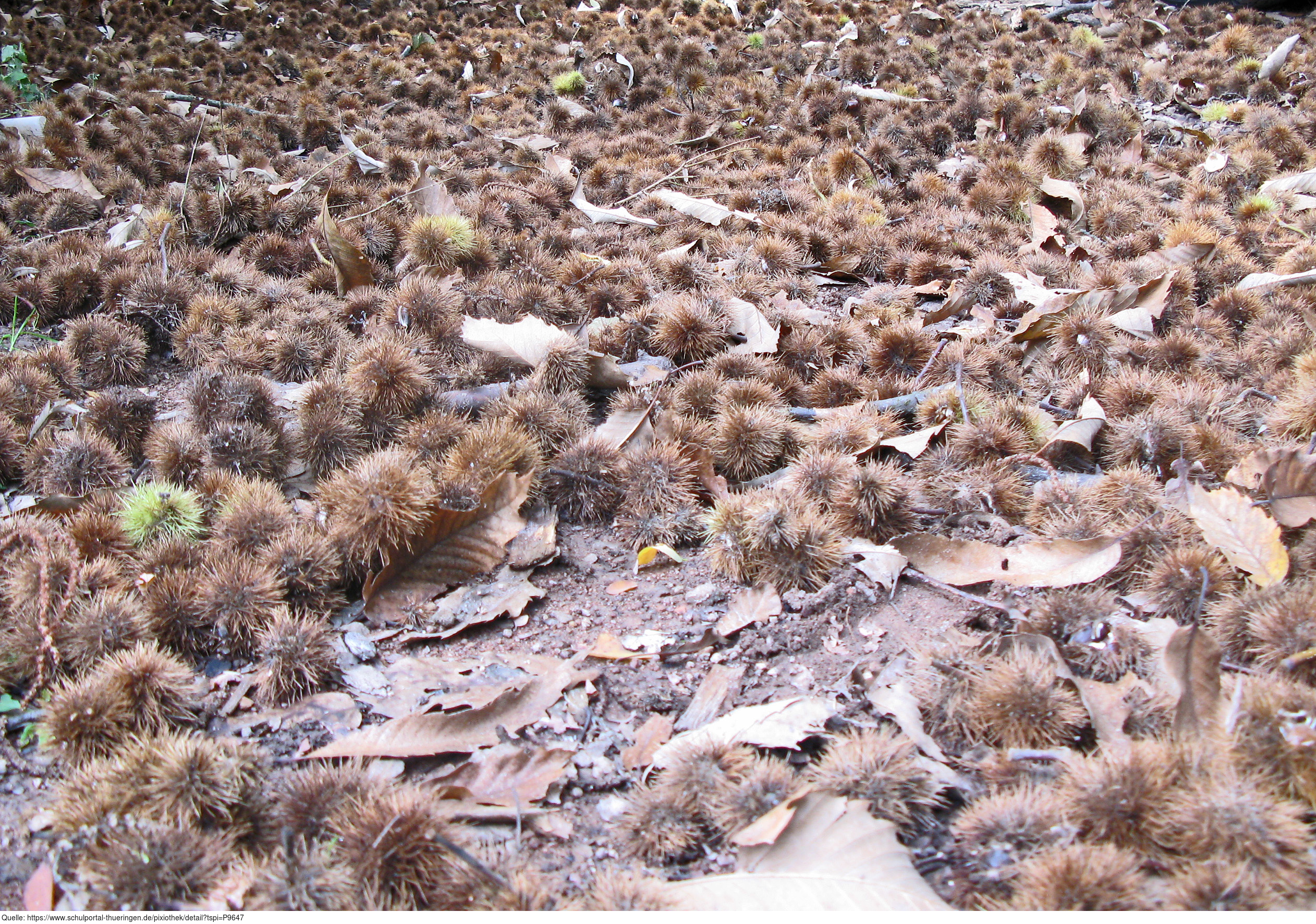 Das Foto gehört zur Serie "Laubbäume". Es zeigt abgeworfene Fruchtbecher der Edelkastanie (Castanea sativa), auch Esskastanie genannt. Die Früchte in den Fruchtbechern sind Maronen bzw. Esskastanien. Das Bild ist unter CC0 lizenziert und kann somit frei verwendet werden.