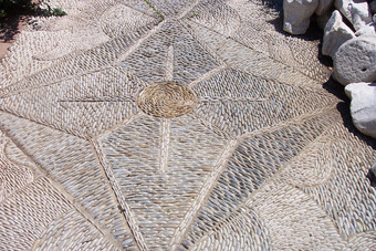 Das Foto gehört zur Serie "Strukturen und Oberflächen". Es zeigt eine mit Natursteinen gepflasterte Fläche. Das Ornament besteht aus länglich-ovalen Steinen, die aus dem Geröll natürlicher Wasserläufe stammen. Das Bild ist unter CC0 lizenziert und kann somit frei verwendet werden.