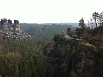 Abgebildet ist ein Motiv aus dem Elbsandsteingebirge. Das Gebirge erstreckt sich vom Oberlauf der Elbe in Sachsen (Deutschland) bis nach Nordböhmen (Tschechien).