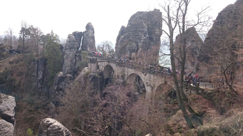 Abgebildet ist ein Motiv aus dem Elbsandsteingebirge. Das Gebirge erstreckt sich vom Oberlauf der Elbe in Sachsen (Deutschland) bis nach Nordböhmen (Tschechien).