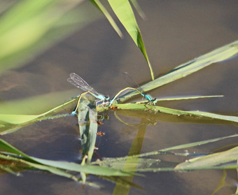 Das Foto gehört zur Serie Libellen. Es zeigt Gemeine Binsenjungfern (Lestes sponsa). Die Gemeine Binsenjungfer gehört zur Familie der Teichjungfern und wird 35 bis 39 Millimeter lang. Die Flügelspannweite beträgt circa 4 bis 4,5 Zentimeter. Es gelten die Nutzungsbedingungen der Mediothek und Pixiothek.